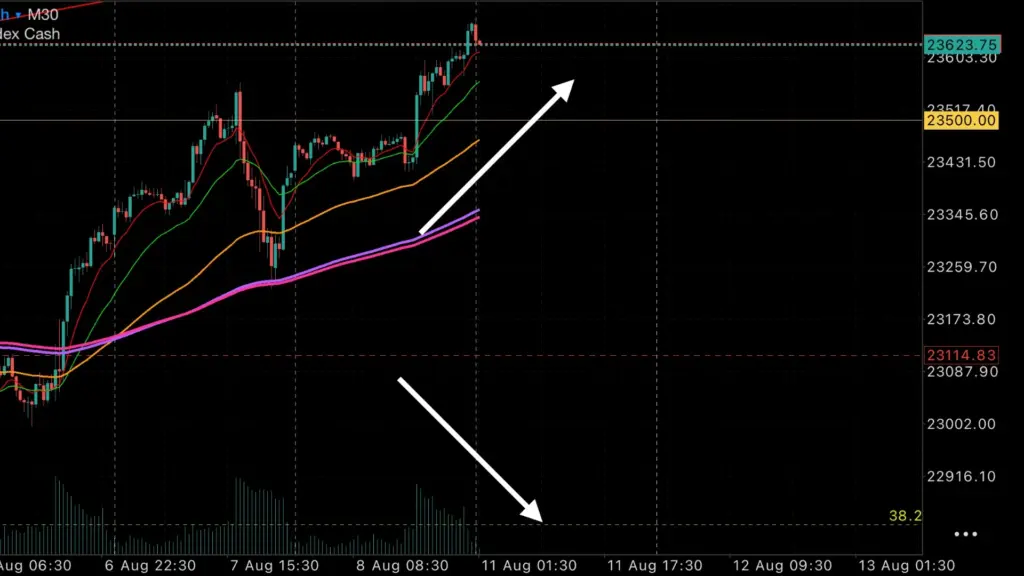 短期(30分足)ではナスダック100にダイバージェンスが出現し、日足では出来高を伴わない上昇が継続しています。