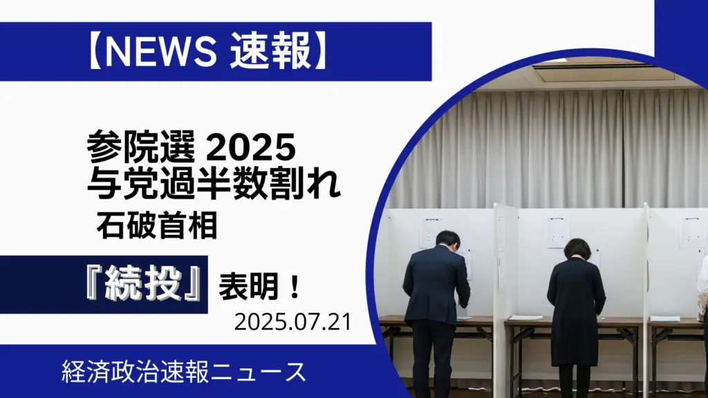 2025年7月20日に投開票された参議院選挙(第27回)で、自民党は改選39、公明党は改選8議席にとどまり、与党全体で47議席となりました。非改選を含めても、必要な50議席に届かず、与党が過半数割れを喫しました。
