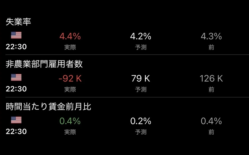 最も注目される非農業部門雇用者数(NFP)は、市場予想の増加見込みに反して-92K(9万2000人の減少)というマイナスを記録しました。また、失業率も前回の4.3%から4.4%へと上昇し、一見すると米国経済の急速な減速を示唆するような結果となっています。