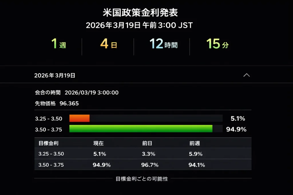 FRBは雇用の悪化だけでなく「物価の安定(インフレ抑制)」も重視しています。今回のように平均時給が前月比+0.4%と上昇している状況では、性急な利下げが再びインフレを加速させるリスクがあるため、直近の3月FOMCでは金利据え置きが有力視されています。