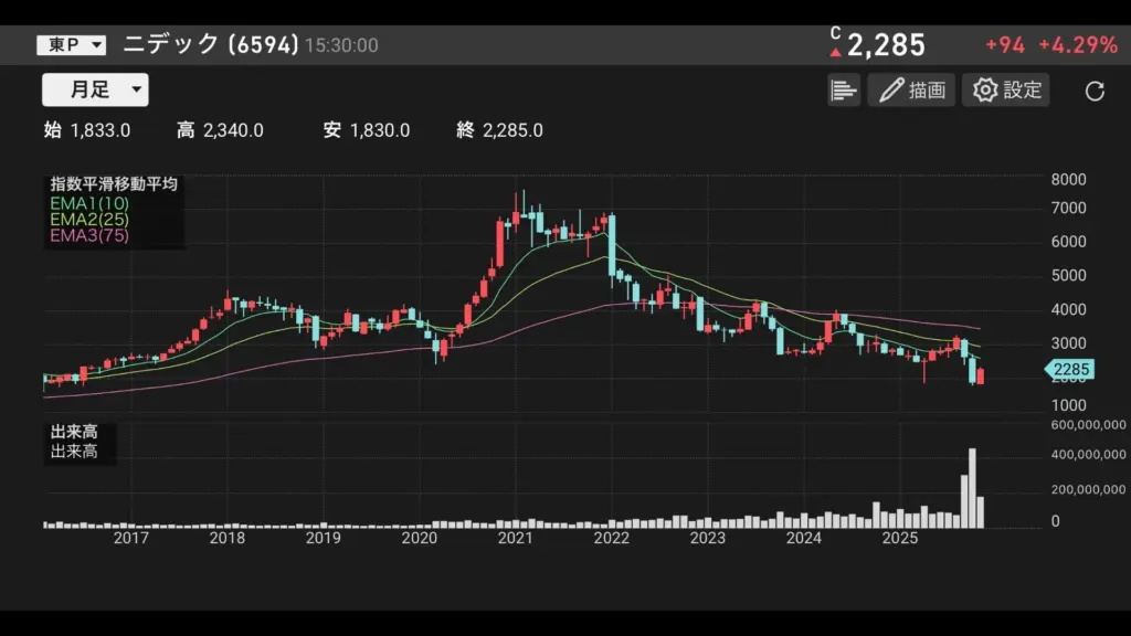 ネガティブなニュースが大きく拡散した直後こそ、“割安に拾える”時間が生まれます。ニデックの場合、PER約13倍・PBR約1.5倍という現実的な水準にあり、第1四半期の業績速報値はプラス圏。最終的な追徴の確定まではノイズが続き得ますが、分割エントリー+イベント分散で期待値の高いリスクリワードを狙える局面だと考えます。