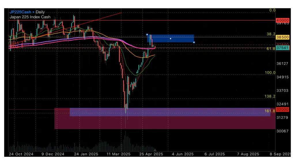 関税ショックから38,500円までは戻していますがチャートからおそらくこの38,500円が抵抗帯となりここを上抜けれるかどうかが40,000円代で推移出来るかどうかのポイントだと考えています。