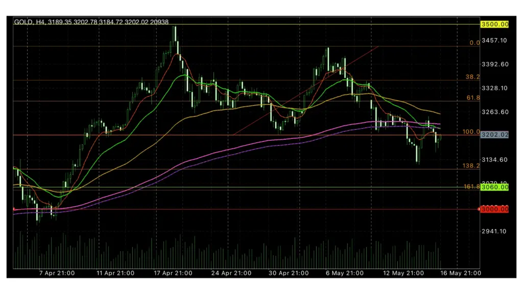 買い建てで入られるかたは、今週の最安値とみてフィボナッチ指数で測った161.8〜$3,000を最後のサポートラインとみており、利益確定は、フィボナッチ指数38.2%〜価格は$3,350近辺ぐらいまでだと考えております。また、売り建て空売りを仕掛けようとしている方は前回高値を狙ってくるまでは待ちの時間になるとみています。