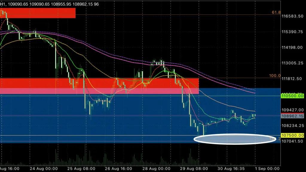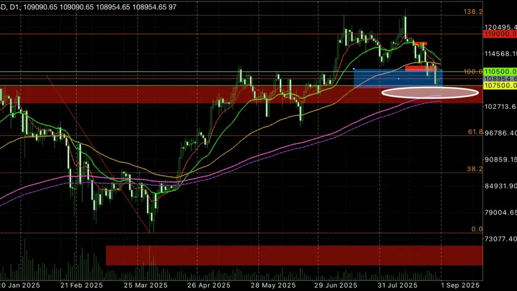 現在の価格は、日足でFibonacci 100.0%と200EMAが交わるテクニカルの節目に位置しています。一般に、重要MAとFib節目の重合は、短期的な需給反転を誘発しやすい一方で、トレンド反転(中期)を保証するものではない点に注意が必要です。