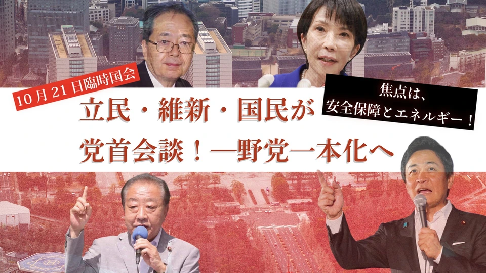 公明党が10月10日に自民党との連立離脱を決定し、26年続いた自公の協力関係は解消された。これを受け、野党側は首相指名選挙での統一候補擁立に向けて動きを加速。立憲・維新・国民の3党は10月15日に党首会談を行い、一本化協議を正式にスタートさせる。