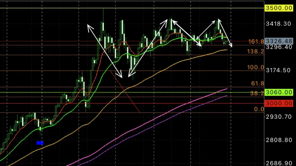 2025年7月現在、金価格は日足チャート上で「左肩」「ヘッド」「右肩」のベッドアンドショルダー形状を描きつつある状況です。