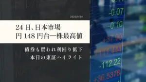 24日の日本市場は「債券↑・円安・株高」の三拍子。米長期金利低下の流れと、国内で財政拡張への警戒感が後退したことが追い風となり、日経平均は終値で最高値を更新。為替はドル/円=148円台に下落し、AI・防衛関連が指数をけん引しました。長期債高・利回り低下しました。