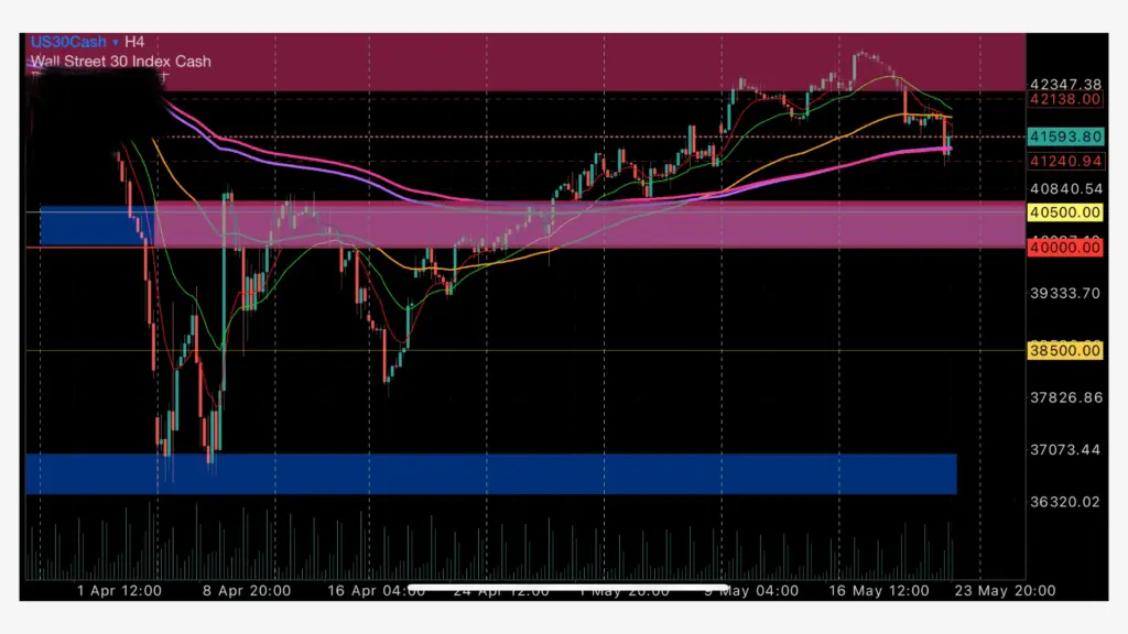 4時間足から見る中期視点については、今、200EMAに支えられてきていますので週前半に少し上がるタイミングがあるかもしれませんが1時間足等は既に200EMAが上に被さってきていますので、4時間足で週前半上げてきたとしても$42,000ぐらいを上値に降りてくるのではないかと考えております。