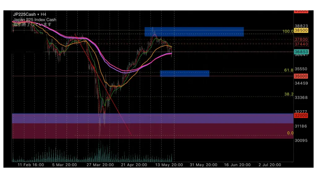 4時間足からみる中期視点についてですが、中期視点といいましても時間軸で考えると概ね1〜2週間程度でみて頂きたいのですが、来週の価格推移は¥35,000〜38,500の幅内にて推移すると考えており、基本的にはトレンドは下に向かっていると考えておりますので、週前半に上がってきたら売るイメージでいいと考えています。
