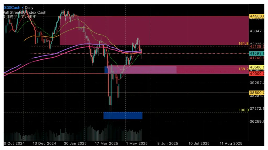 日足で見るとトランプ関税ショック前の高値辺りが上値抑えるゾーンとなっており、先週の戻り高値辺りでやはり新しい抵抗帯となっている事が確認できました。